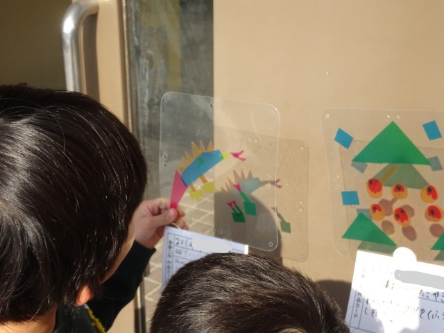 図工で色セロファンを切ったり貼ったりして、好きな形を作りました。