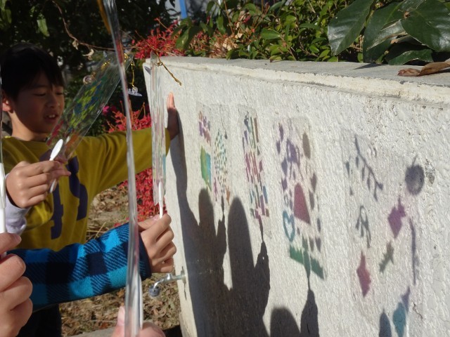 2年生がセロファンを貼った作品を、いろいろなところに写して楽しんでいます。