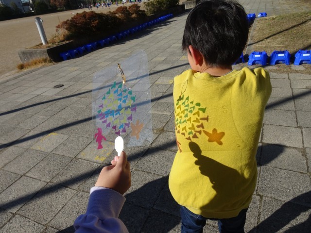 友達の背中に写して「○○くんの背中にも写って、おもしろい!」と楽しむ子。
