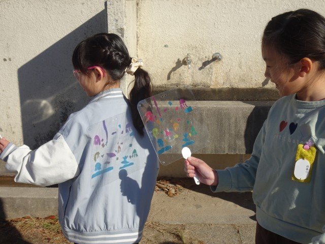校舎の壁にかざして、「学校が魚でいっぱいになった!」と言っている子。