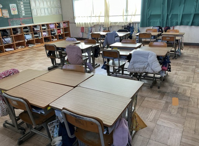 誰もいない教室ですが、机も椅子もきれいに並んでいます。