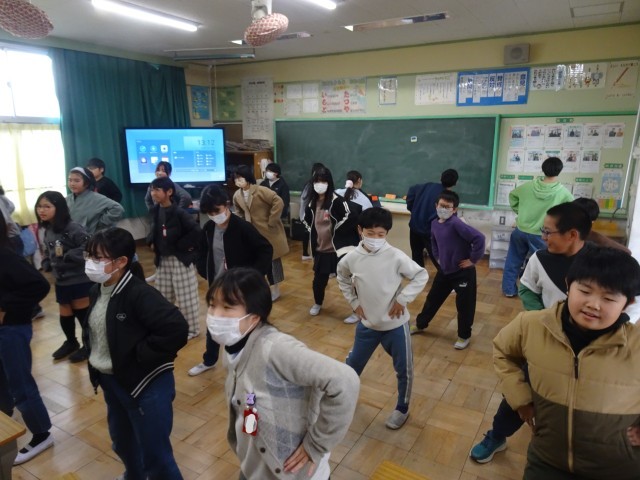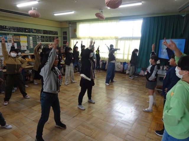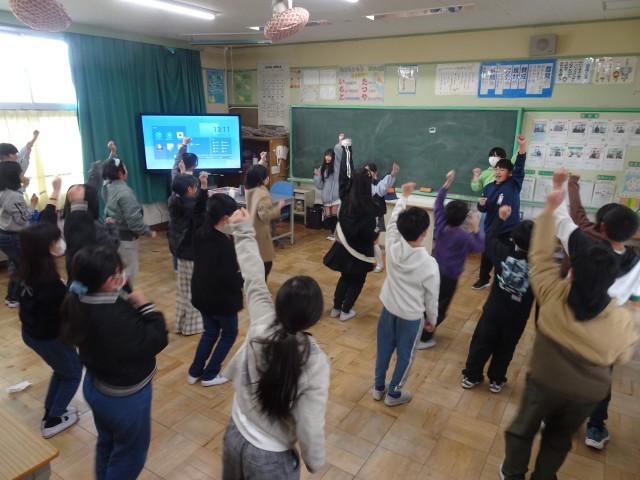 給食の後、机を後ろに移動させて、自分たちで何やら準備しています。