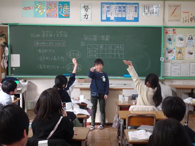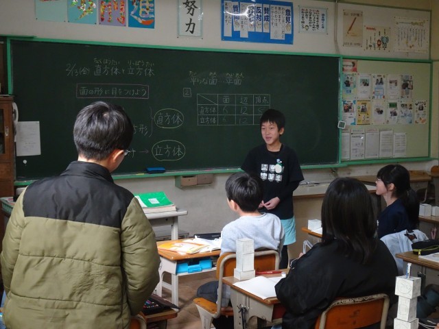 クラスのみんなに自分の作った立体の名前を出題し、今日の学習が理解できたかを確認しています。