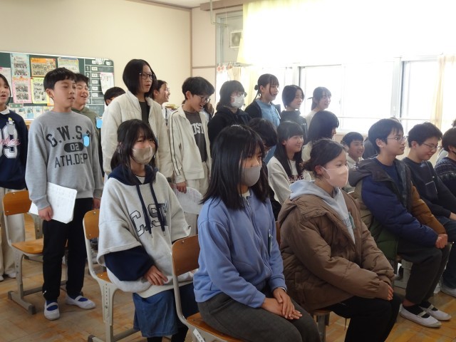 学年での全体練習が始まる前に、学級ごとによびかけの練習や流れの確認をしています。