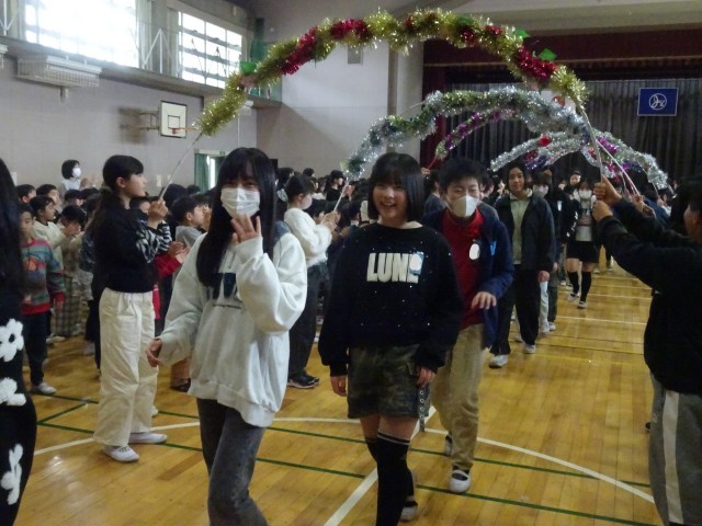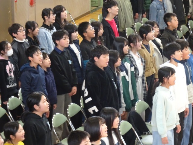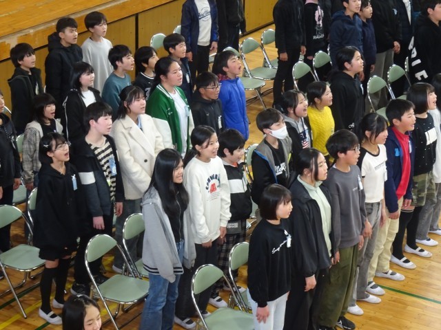 3/2 6年生を送る会 6年 公開日 2026/03/02 更新日 2026/03/02 学校行事 6年生は、1~5年生にお礼の気持ちを込めて、歌を歌いました。さすが6年生、心が一つになった響きのある歌声です。1~5年生は、6年生の力と思いをしっかりと受け取りました。これまでの計画や準備、今日の運営をがんばってくれた5年生のみなさん、ありがとう。これからは、あなたたちが共長小のリーダーです。 +4 学校行事