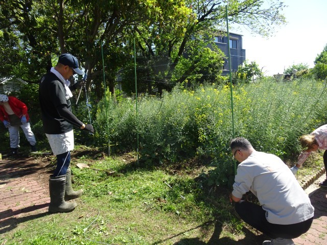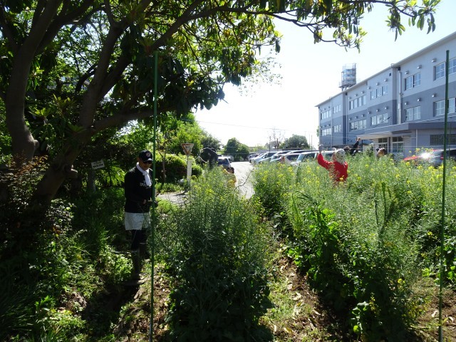 今日は、咲き終わった菜の花の種を鳥から守る対策をしてくださいました。