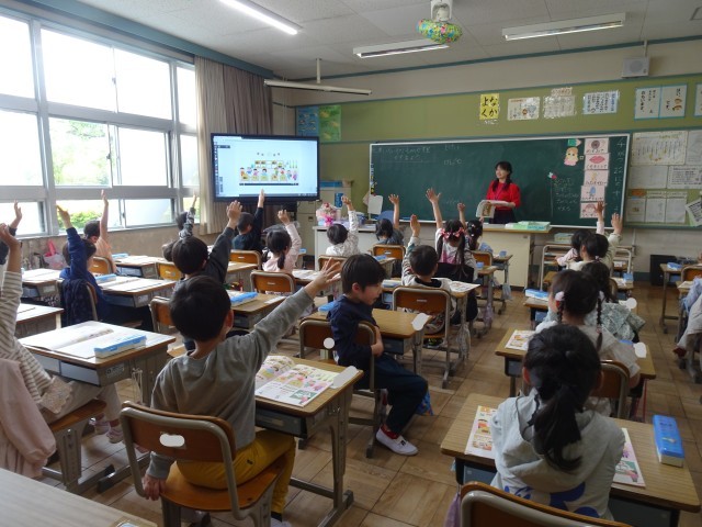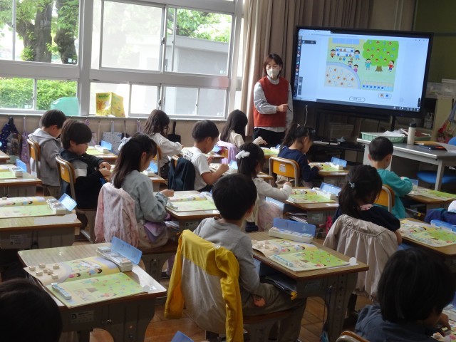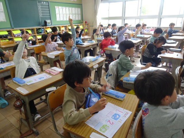教科書の絵を見ながら、何がいくつあるか、それを表す数字について学習しています。
