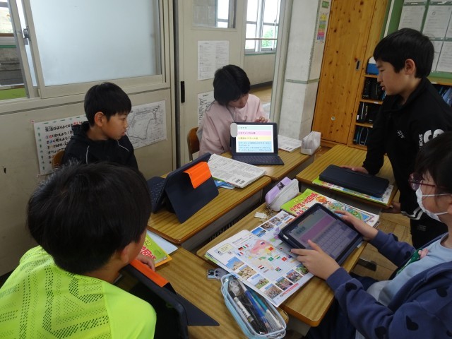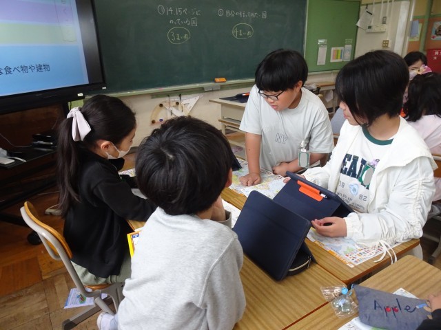 言葉、食事、有名な建物など、タブレットで調べ学習が進みます。