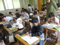 1組は書写で、筆順に気を付けて硬筆で書く練習です。これまでに学習した筆順のきまりを思い出し、同じきまりの文字を探して書いています。