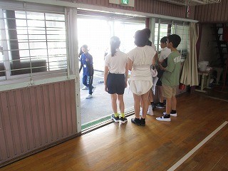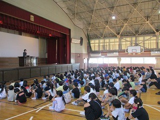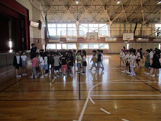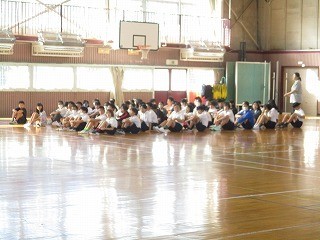 今日も6年生が一番に体育館で待っていました。1年生も静かに入場し、自分たちで声を掛け合って並ぶことができるようになっています。
