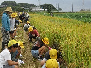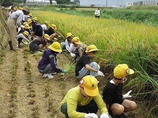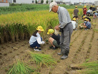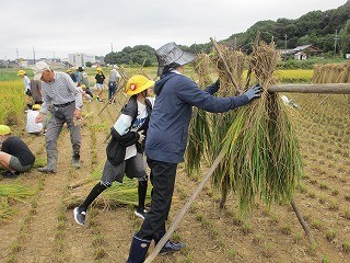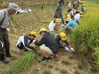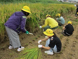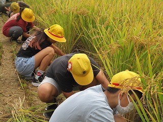途中で雨が降り出し、すべての稲を刈ることはできず残念でしたが、全員が稲刈りを体験することができました。