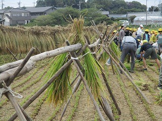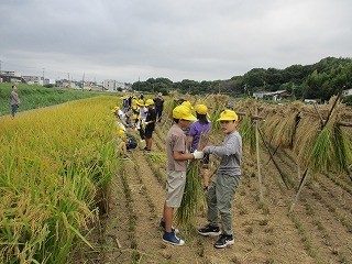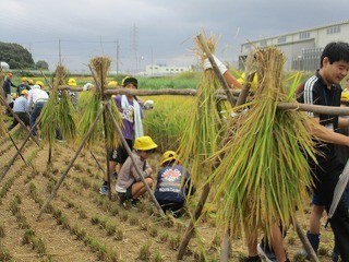 鎌を使うのが初めての吉田っ子もいました。引いて切るのが難しく、のこぎりのようにギコギコ切ったり、力が弱かったりして苦労していました。でもそれ以上に苦労していたのは、稲の束を紐で束ねるところのようでした。ふつうに結ぶのではなく、ほどけにくくするために2回紐をくぐらせます。軍手をしているので力が入らず、はさ掛けするときに、稲の束がバラバラになってしまうこともありました。