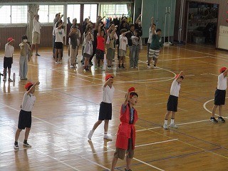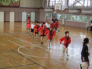 太鼓の音に合わせて立ったり座ったり、大きな声を出したり、だんだん息が合ってきました。