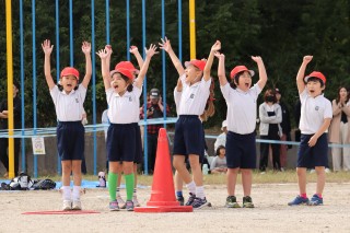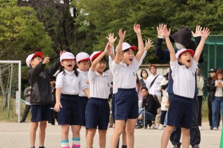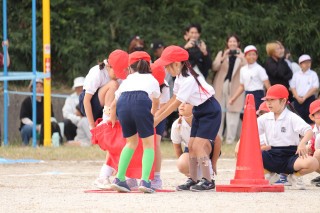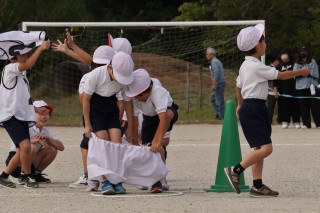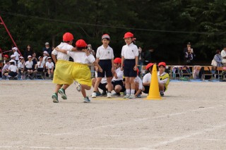 4色のデカパンを使って、4チームで競うデカパンリレーは、2人で息を合わせるのが大変です。始めはパンツをはくのにも脱ぐのにも時間がかかっていましたが、本番では2人の息も、チームの息もピッタリ。元気な声援が運動場いっぱいに響いていました。