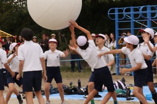 全校競技「大玉送り」は、低学年が地面を転がし、高学年は頭の上を地面に落とさないように送ります。