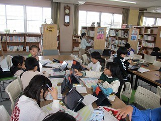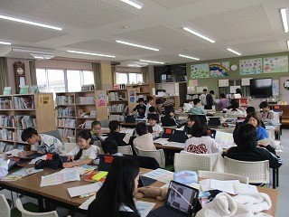 図書室では、「中心となる語や文を見つけて要約し、調べたことを書こう」で、キャンディーチャートを使いながら自分が興味をもった工芸品についてまとめていました。江戸切子や鎌倉彫、有田焼きなど、色や用途、どんなところがすばらしいかなどを書き込んでいました。最終的に文章で表します。
