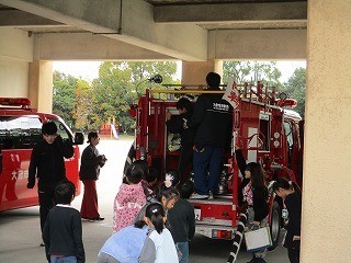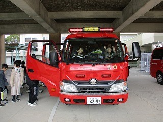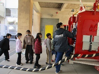 消防団で使っているポンプ車の仕組みを教えていただいたり、車に乗せていただいたりしました。また、消防団吉田分団の詰め所にも入らせていただき、何があって、どんな活動をされているのかを教えていただきました。