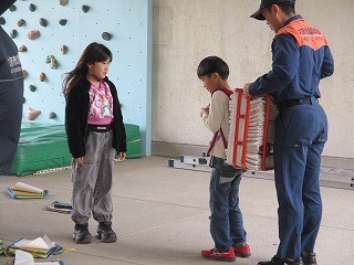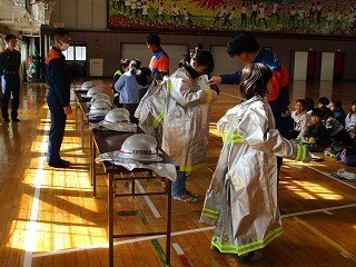 体育館では、防火服を着る体験をしました。熱に強く、切れたり破れたりしにくい防火服は、とても重くて動きにくかったようです。