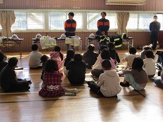 3年生の消防出前講座のために、大府市の消防署と消防団吉田分団の方に来ていただきました。