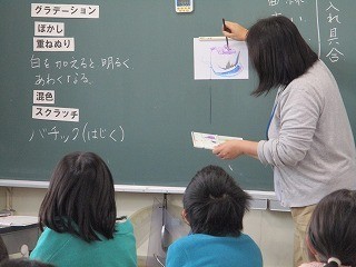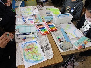 風鈴の音を聞いて、感じた色や形を、塗り重ねたりぼかしたりグラデーションにしたりして、思い思いに表現しました。友だちの作品を見てよさを感じ取り、自分の作品に生かす子もいました。