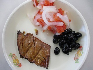 ごはん、牛乳、ぶりのみりん焼き、しらたま雑煮、大根とにんじんの紅白なます、黒豆
