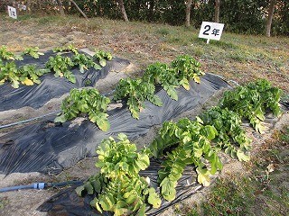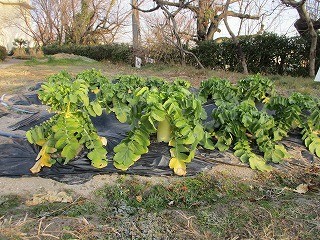 2年生が育てている大根が、大きくなってきました。土の中から力強く「首」を出しています。葉も青々としています。おいしい大根になるかな?
