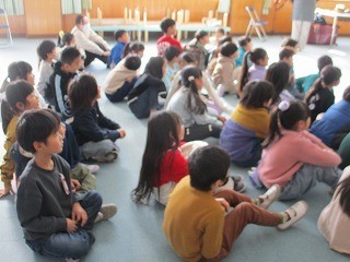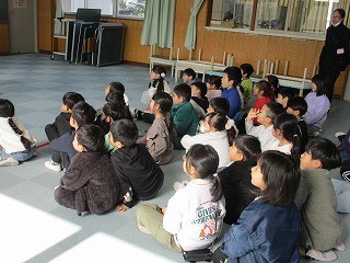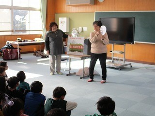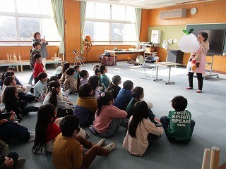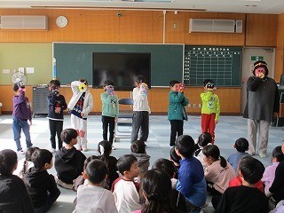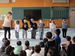 1年生が、ましゅまろーずさんに、エプロンシアターや読み聞かせ、腹話術などをしていただきました。