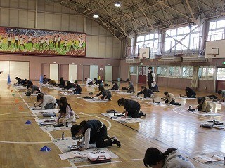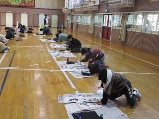 「春の海」が流れると、書き初め会モードになり、静かに書き初め会が始まりました。手本を見ながら、一生懸命書く姿が見られました。