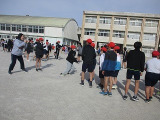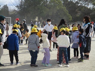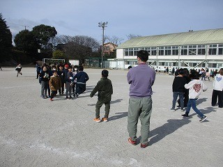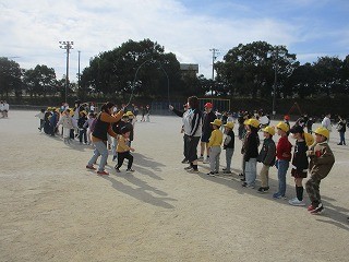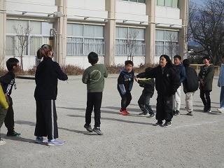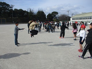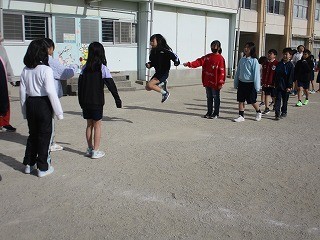 低学年の縄は、ペアのお兄さん・お姉さんが回します。お兄さん、お姉さんは、タイミングよく跳べるように声をかけたり、リズムよく回したりしていました。