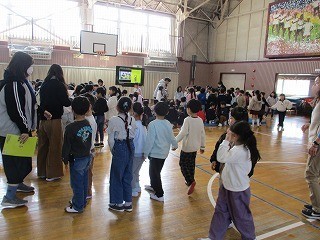 年長さんは、1年生と手をつなぎ、おまねきかいの場所へ移動しました。