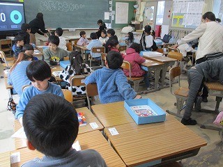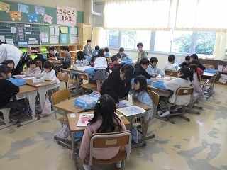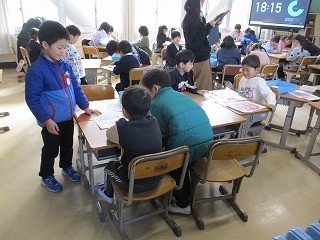 1年生が見本を見せながら、年長さんに作り方や遊び方を教えていました。年長さんは1年生の言うことをよく聞いて、色を塗ったり遊んだりしました。