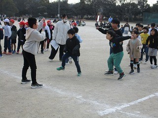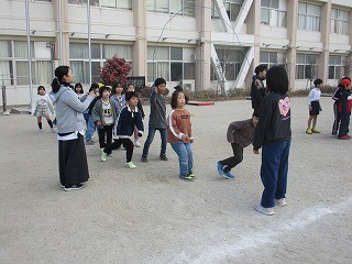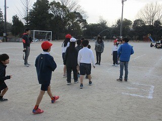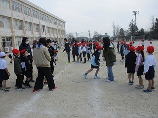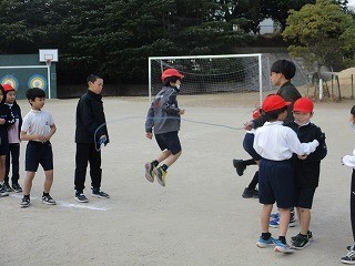 練習の成果があり、クラスの記録を更新するチームもありました。縄を回すペアの高学年が、声をかけながら、低学年の跳ぶタイミングに合わせるように一生懸命縄を回す様子が印象的でした。