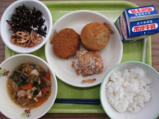 大皿は、きなこ揚げパンとメンチカツと唐揚げで、思い切り茶色!調理員さんが「6年生はよく食べる」と言っていましたが、まさに6年生が大喜びするメニューでした。