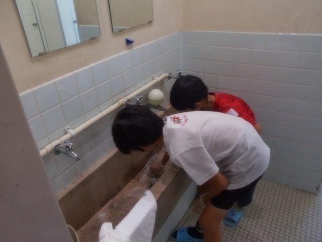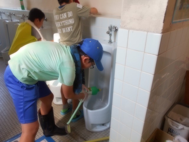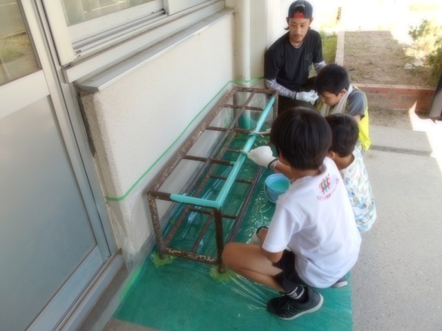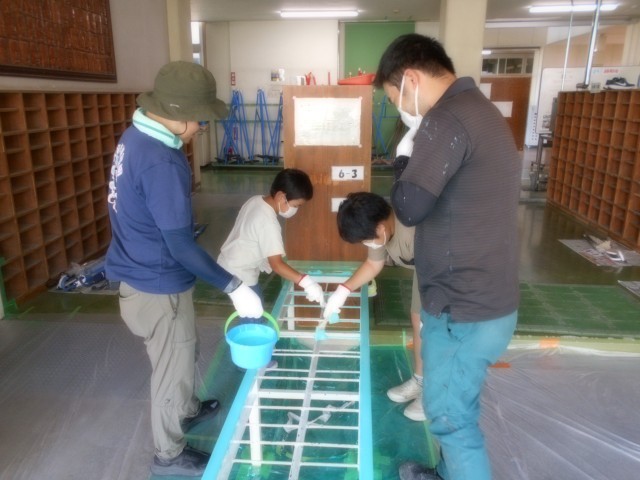 まず、北館、南館のトイレ掃除を全員で行い、その後、南館昇降口の傘立てと1年生教室の傘立てのペンキ塗りを行いました。