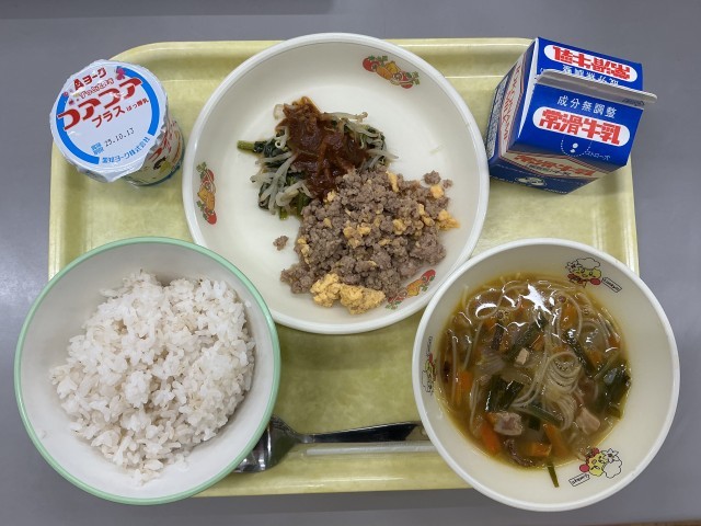 今日の献立は、むぎごはん、牛乳、ビビンバ(肉卵そぼろ、野菜ナムル、たれ)、ビーフンスープ、