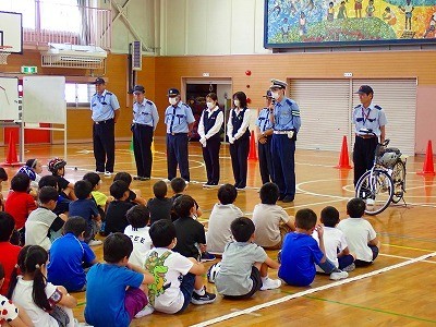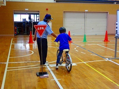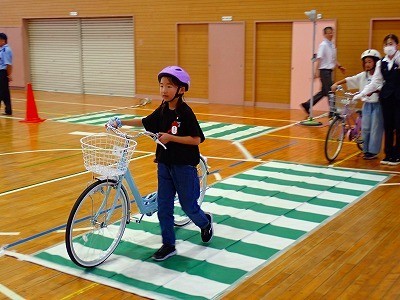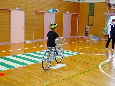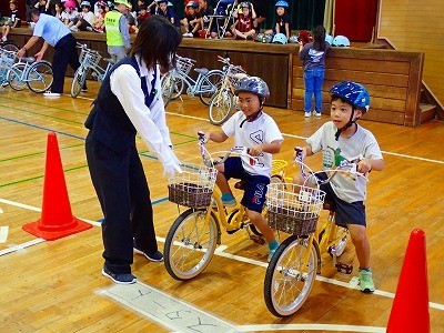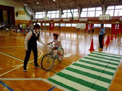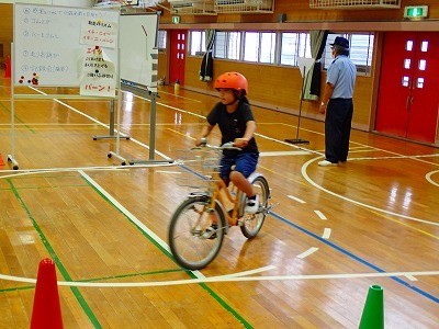 警察署の交通課の方や交通指導員の方をお招きし、体育館で実際に自転車に乗りながら自転車の安全な乗り方について学びました。