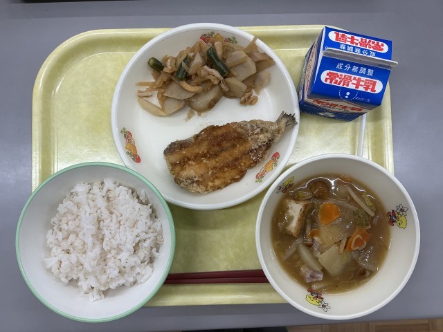 今日の献立は、むぎごはん、牛乳、いわしのかば焼き、切り干し大根と里芋の煮物、実だくさん汁でした。