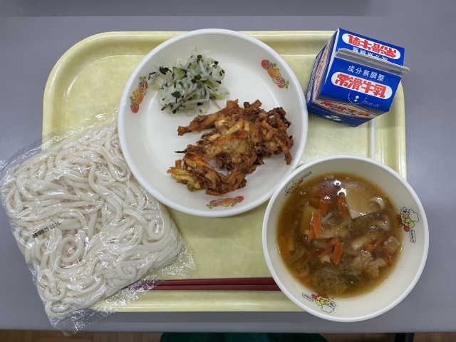 今日の給食は、白玉うどん、牛乳、和風あんかけ汁、さつまいものかき揚げ、