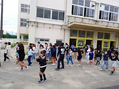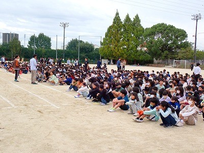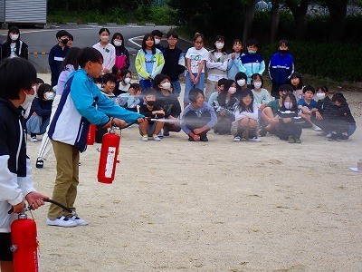 21日(火)に火災避難訓練を行いました。給食室が火災発生場所という設定で、運動場へ避難にしました。
