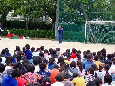 消防職員の方からのお話では、「『お・は・し・も』を守ることは、自分の命だけでなく、友達の命を守ることにもなる」というお話があり、みんな真剣に話を聞いていました。