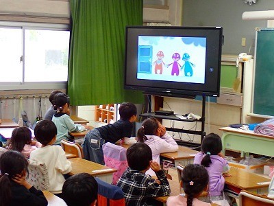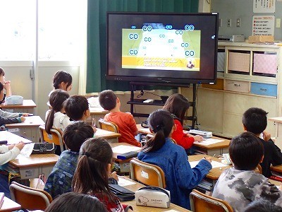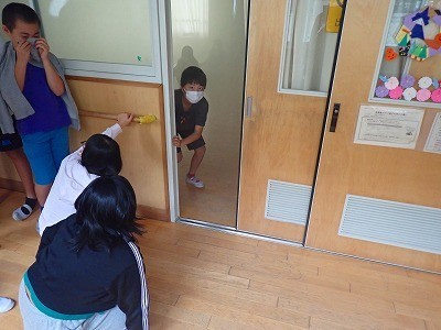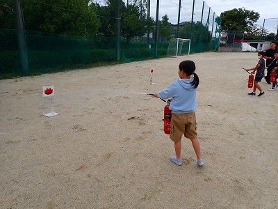 その後は、1~3年生は教室で防災に関するビデオを見ました。4・5年生は消火器訓練を行い、水消火器を使って消火器の使い方を学びました。6年生は煙室体験を行いました。