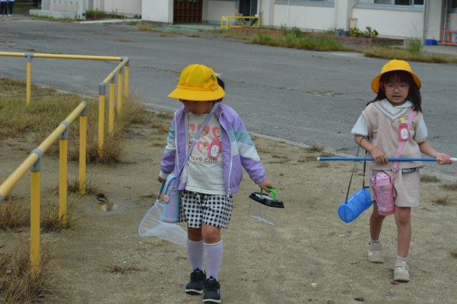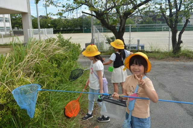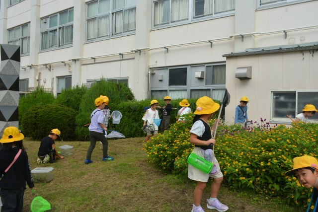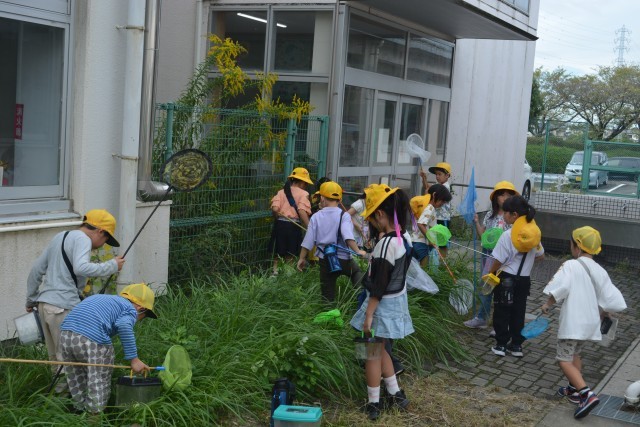 こどもたちは、バッタやカマキリ、コオロギを捕まえていました。