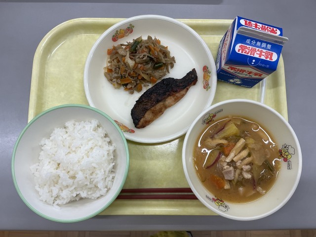 今日の献立は、ごはん、牛乳、鮭のしょうゆこうじ焼き、五目きんぴら、さつま汁でした。