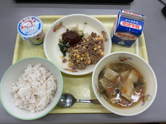 今日の献立は、むぎごはん、牛乳、ビビンバ(肉卵そぼろ、野菜ナムル、たれ)、ワンタンスープ、