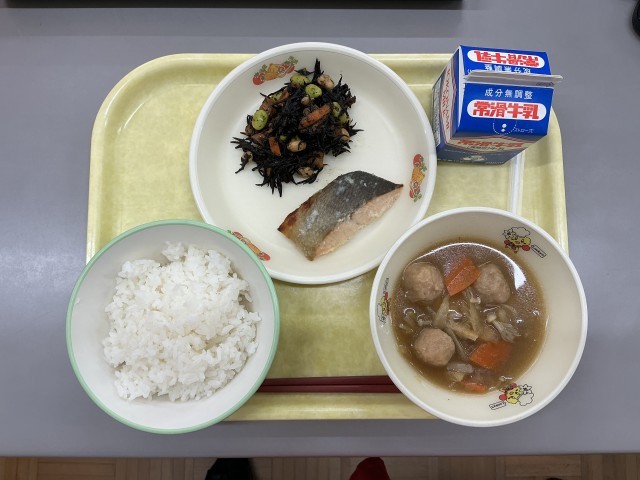 今日の献立は、ごはん、牛乳、さけの塩こうじ焼き、ひじきと大豆の炒め煮、鶏団子汁でした。