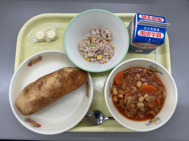 今日の献立は、きなこ揚げパン、牛乳、ポークビーンズ、ツナとれんこんのサラダ、一口チーズでした。