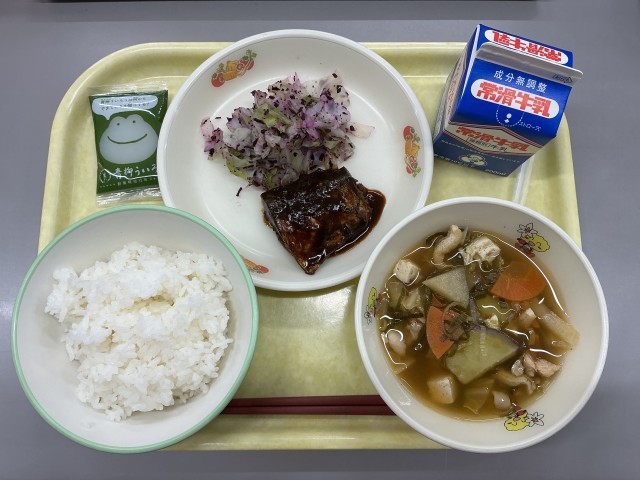今日の献立は、ごはん、牛乳、さばの八丁みそ煮、愛知の赤しそあえ、愛知の秋野菜汁、ういろうでした。