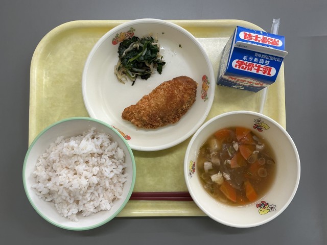 今日の献立は、むぎごはん、牛乳、さけフライのレモンソースかけ、磯香あえ、のっぺい汁でした。
