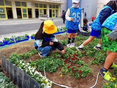 昇降口前のメイン花壇のパンジー&ビオラがきれいに花を咲かせています。