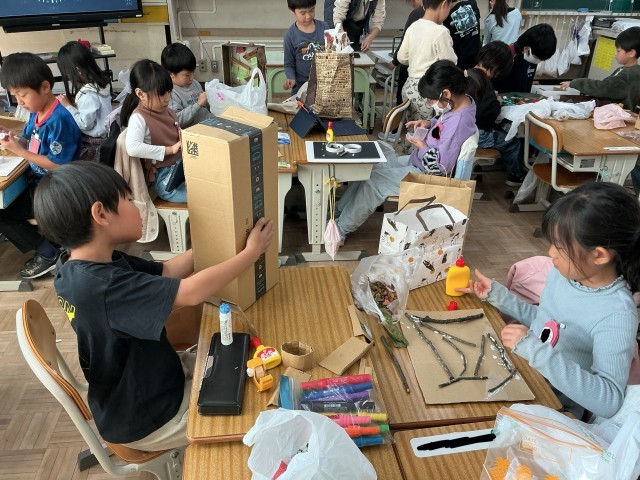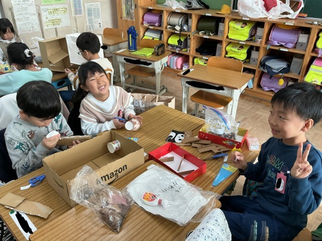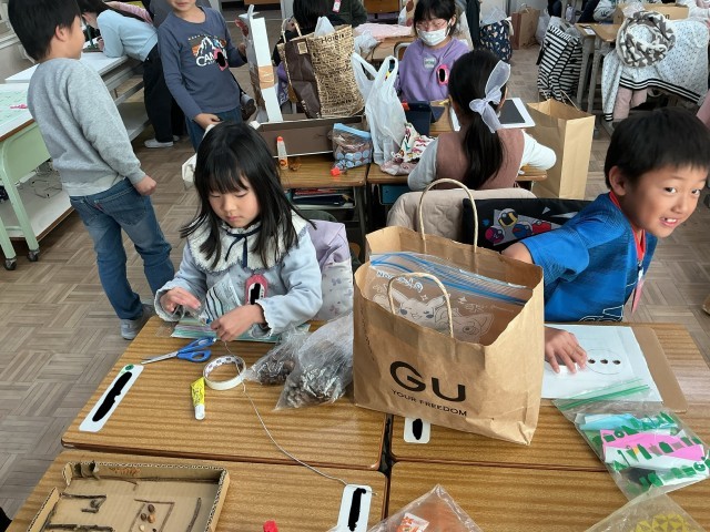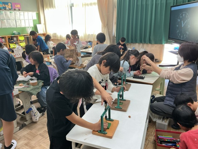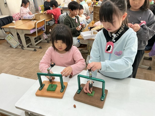 どんぐりに穴をあけたり、くっつけたりしながらおもちゃを作成しています。